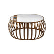 The top is set into a base made from smooth iron, comprised of slats that swell outwards before curving in at the base. The iron has a brass finish, adding a rich metallic tone to this luxe accent piece.