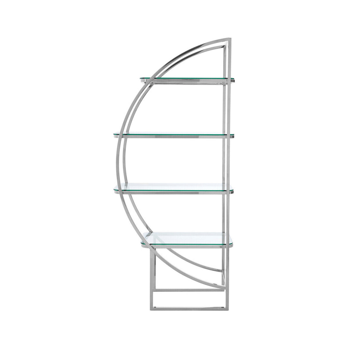 The half moon like frame is made from polished stainless steel. Four glass shelves are integrated in the daring shape. The experimental look of the shelf unit makes it ideal for art deco style interiors.