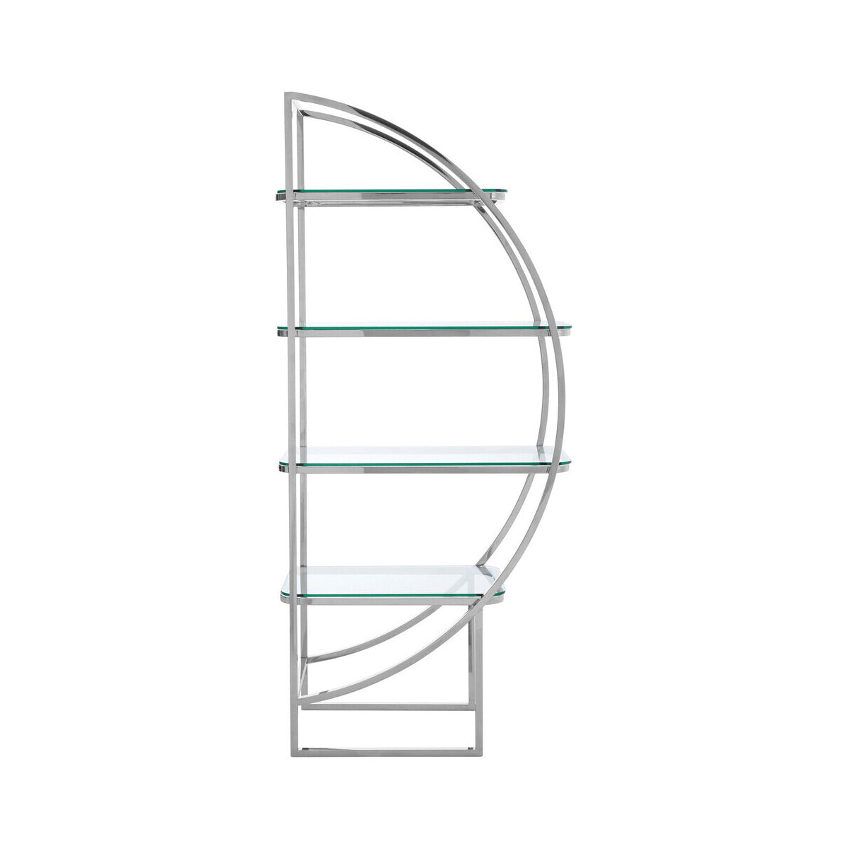 The frame is made from smooth stainless steel and has a reflective mirrored finish that contributes to its glamorous aesthetic. It integrates four display shelves into its perfectly proportioned combination of straight and arcing lines. Each shelf is made from clear tempered glass and extends slightly beyond the frame.