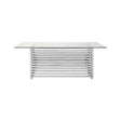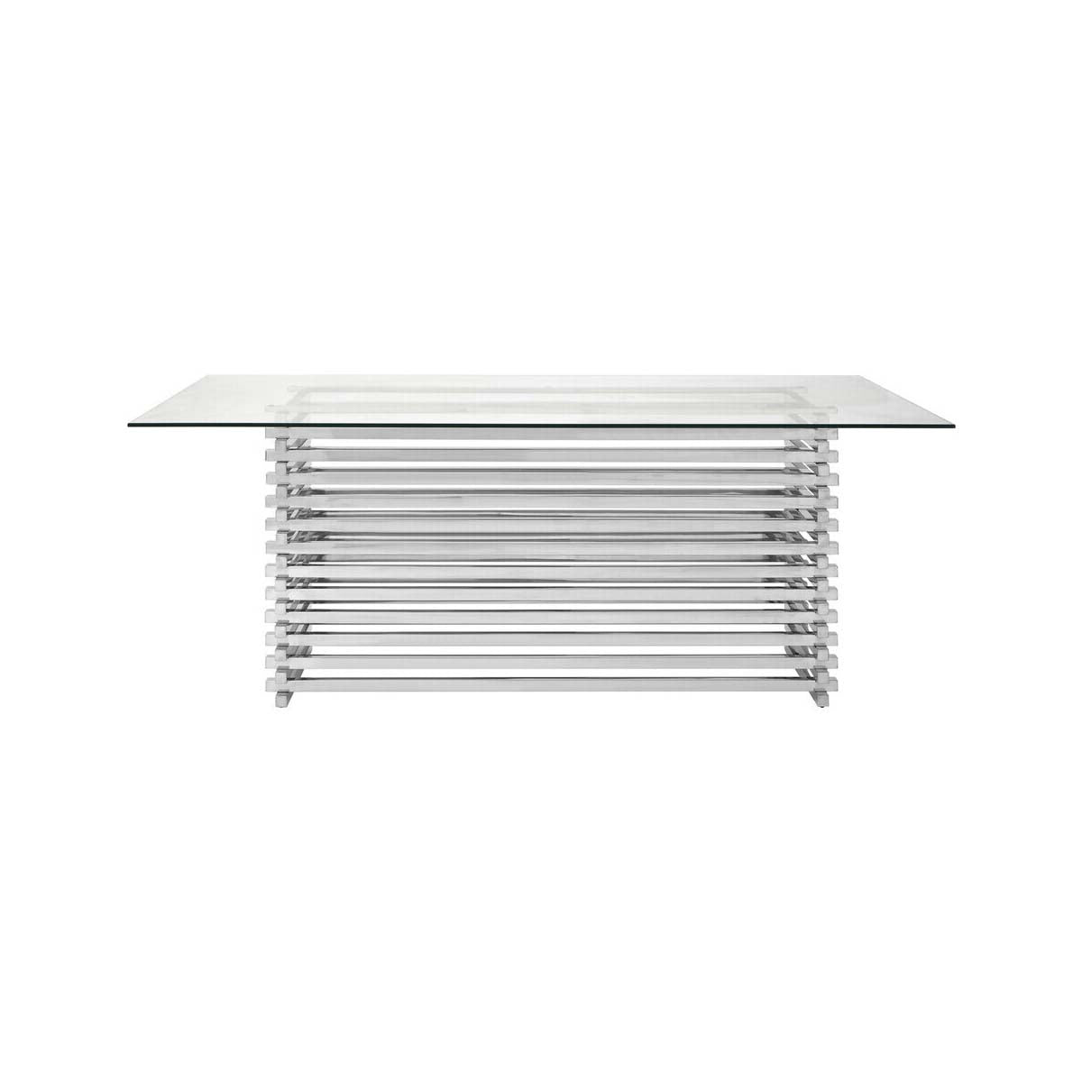 The dining table blends glass and steel to create an urban design. The top consists of a rectangular transparent glass which is supported by a stainless steel structure that brings a boldness with the steel bars arranged over each other.