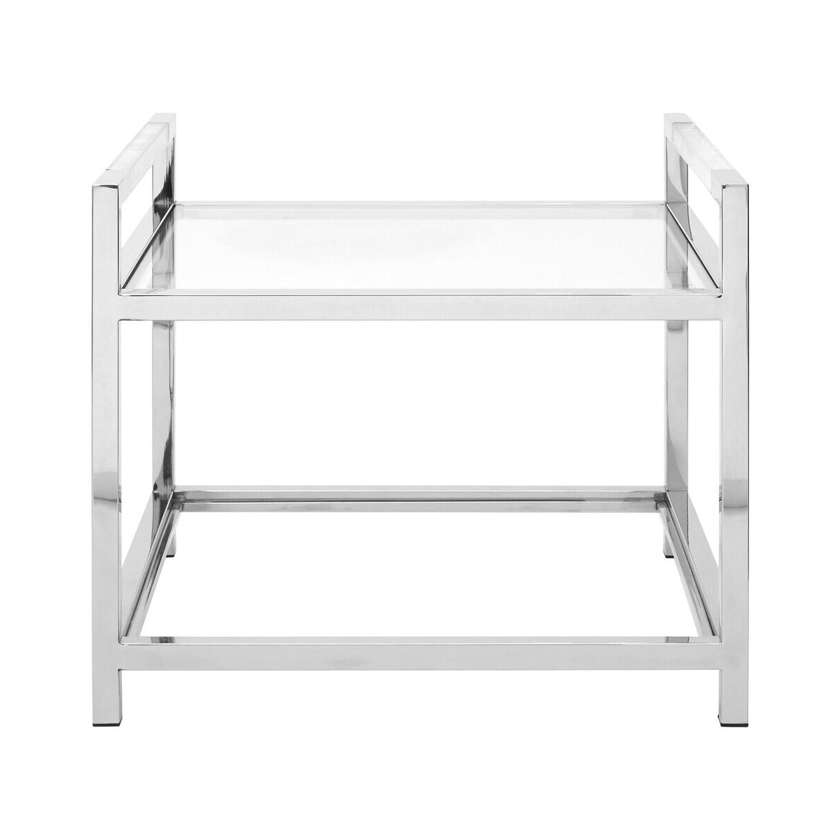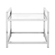This table features two display tiers, each one utilising clear tempered glass to complement the steel. Transparent acrylic blocks are inserted into its upper rails. With its sleek look, it complements luxury boutique hotel furniture and lighting.