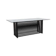 The Vogue dining table has a strong art deco influence, with bold geometrical features balanced by a harmony between materials. The base is crafted from strong matte black stainless steel, supporting a large rectangular glass table top.