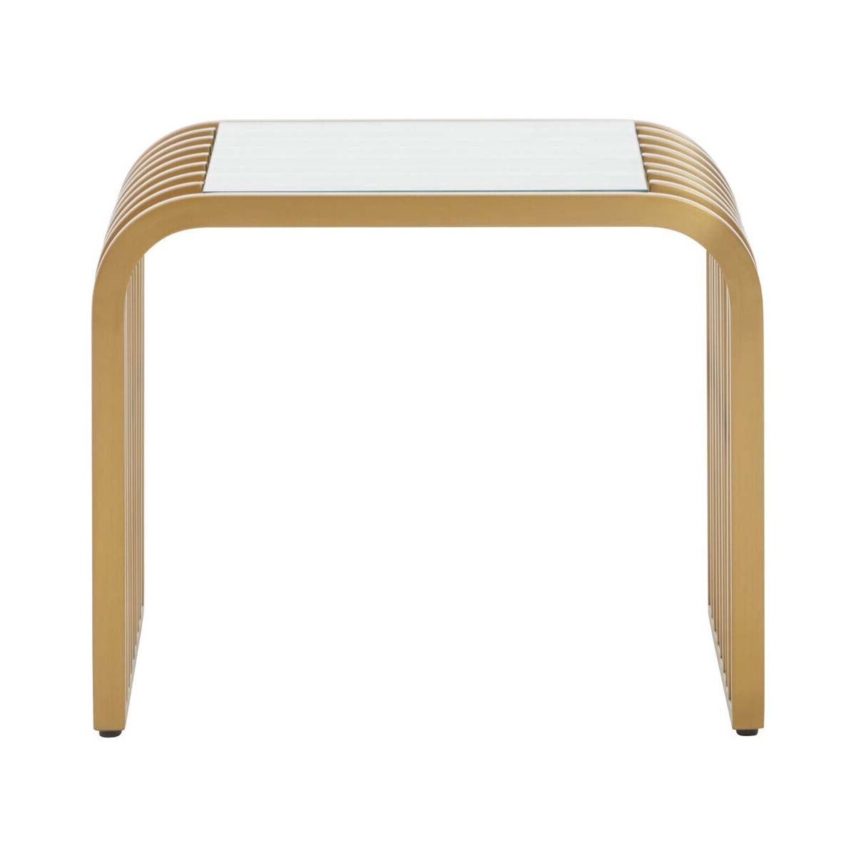 The Vogue slatted end table has a strong art deco influence, with soft lines and strong materials. The slatted matte gold stainless steel sides have a rounded edge when joining the clear glass top, creating a streamlined design.
