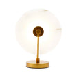 This lamp features a contemporary design with a wheel shaped white marble shade. The shade is held up by two metal rods joined to a round gold finish metal base. The soft glow through the white marble will create a warm aesthetic in any space.