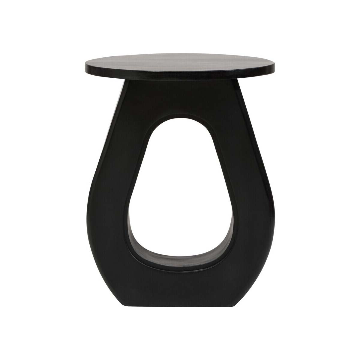 Handcrafted from mango wood in a sleek black finish, this accent table exudes contemporary elegance with its horseshoe-shaped base. Featuring a minimalist design and a rounded top, it adds a modern touch to any living area.