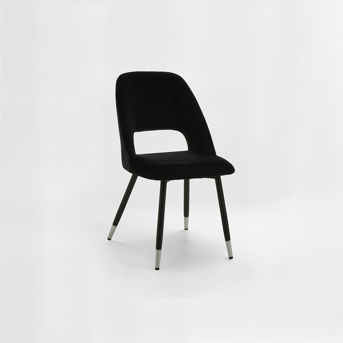 This dining chair is upholstered in black velvet that works wonderfully in a variety of spaces. Exhibiting a tapered back with cut-out design, the foam-padded seat is supported by tapered legs with silver finish tips adding a chic accent to the living area.