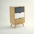 This bedside table is a midcentury modern storage option for your bedroom, offering ample storage space thanks to its three spacious drawers with grey, white, and natural fronts featuring cut-out handles for easy access to the contents inside. The frame of the table is given a natural finish that coordinates well with the slanted wooden legs that not only support the top but add a touch of style as well.