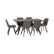 The Westford dining set boasts a modern style featuring a wood-effect rectangular top table with angled black metal legs. The contrast of a brown tabletop and black metal legs creates a contemporary and sophisticated look. The six dining chairs are upholstered in grey faux leather and are cushioned for added comfort. The chairs complement the table's modern style with their clean lines and sleek silhouette.
