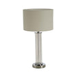Made from translucent glass, this table lamp features a fluted design stand with chrome edges which contrast its round base. The cream fabric shade rests on the decorative base and matches warm accents of the design.