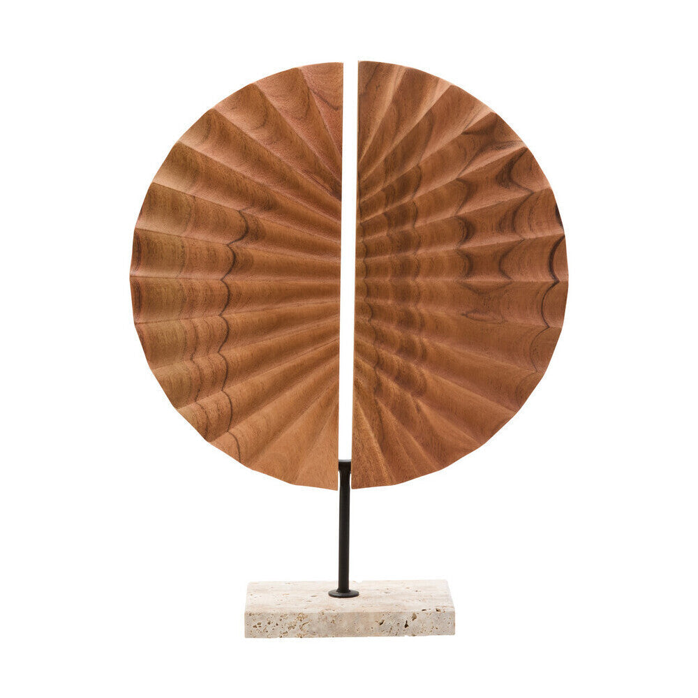 This Westo sculpture is handcrafted by skilled artisans, featuring a carved natural wood disc with a radiating, segmented design. Each segment curves outwards from a central split opening, creating a dynamic sense of movement and texture. The sculpture is mounted on a contrasting, solid travertine base boasting a porous tactile surface further enhancing the organic charm. *Due to the inherent nature of natural materials and the handmade process, slight variations in colour, grain and texture may occur.