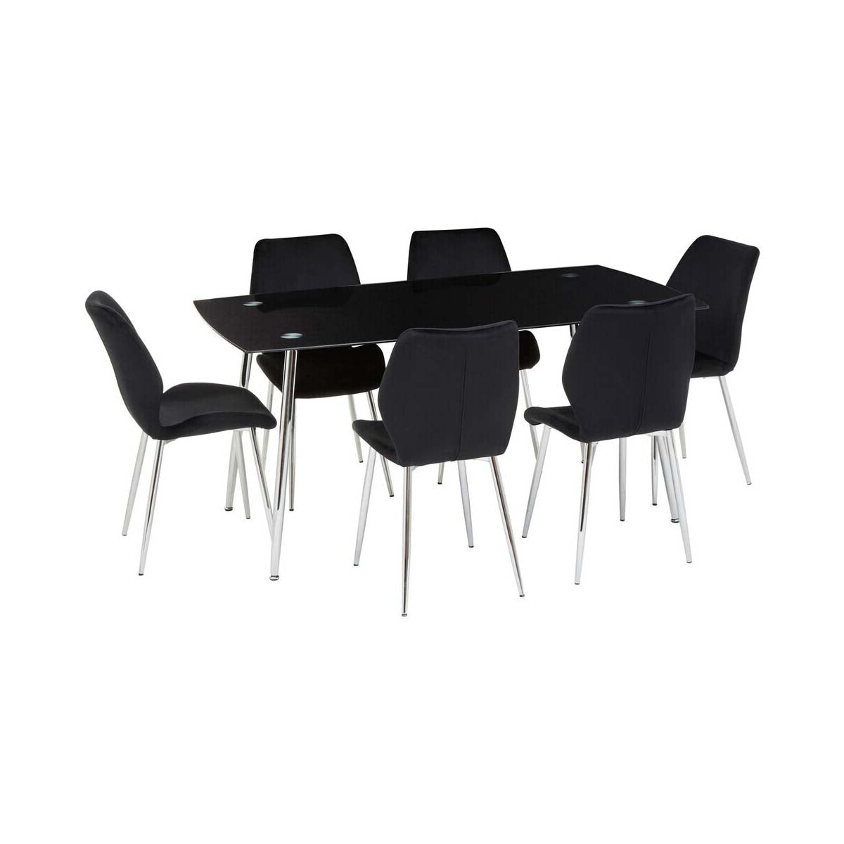 The Wimslow 7pc dining set has a modern contemporary style. Featuring a rectangular glass table with slanted legs, the chairs are upholstered in black velvet which create a stark contrast with their chrome finish angular legs.