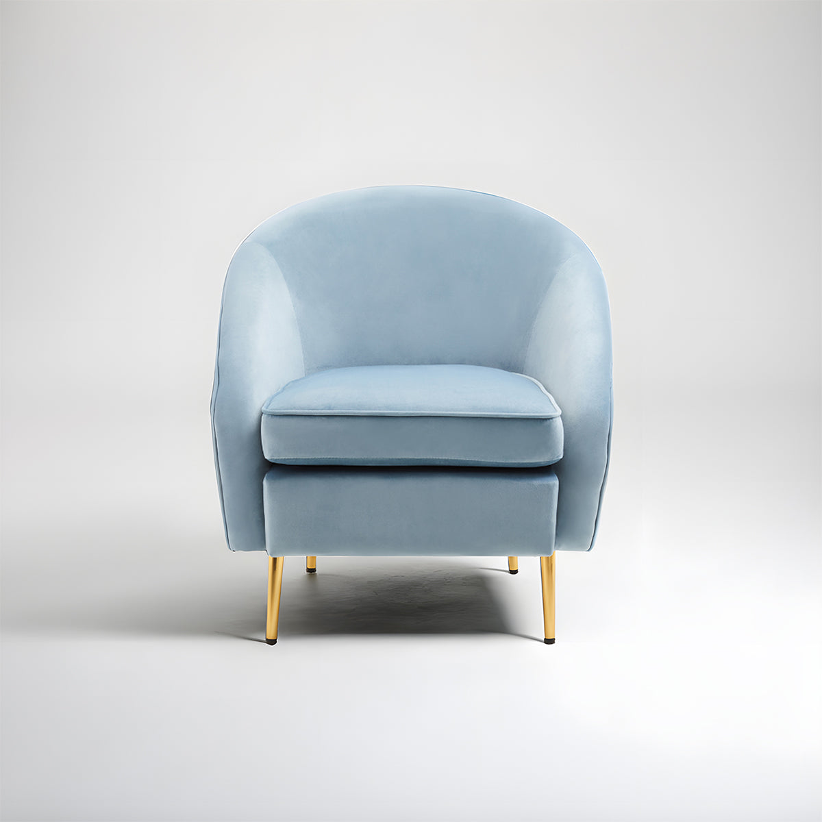 Covered in aqua blue velvet, this armchair has a modern tub back with piped trim along the classic curves. The seat has high density foam cushions for premium comfort complete with gold finish angular legs which bring a touch of sophistication and glamour.