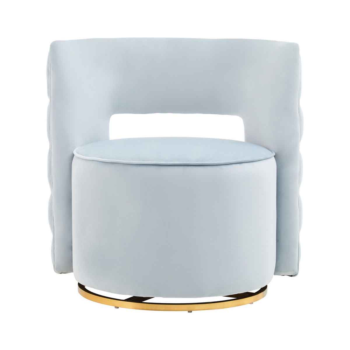 The Yasmeen chair has a circular seat with deep cushioning, upholstered in blue velvet. It is supported by a cutout back with a buttoned exterior. The luxurious seat is positioned on a base that rotates 360 degrees, increasing stability and glamour.