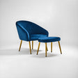Upholstered in midnight blue velvet, this chair has a comfortable backrest in a curved silhouette with sloping armrests. Supported with a matching footrest, the high density foam filling assures premium sitting while gold powder coated legs add glamour.