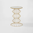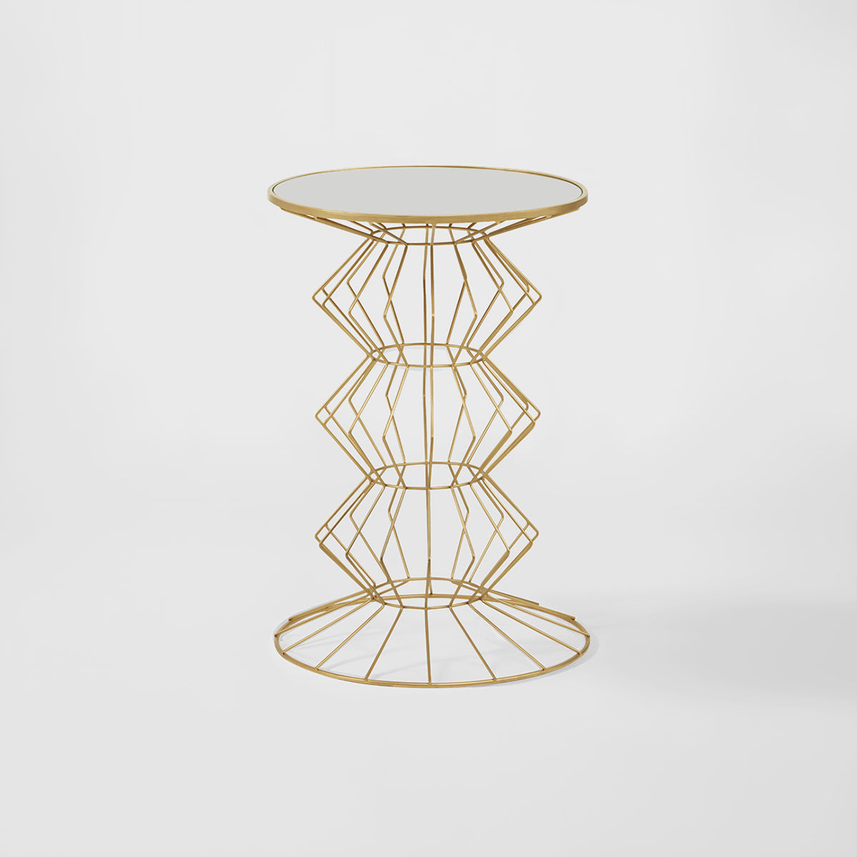 The Yaxi side table adds luxe design style to the living room. Its architectural frame is crafted from metal , and has a concertina-esque stand with a round base and top. The metal has a rich gold finish that complements warm metallic accessories. A pane round of mirrored glass is set into the top.
