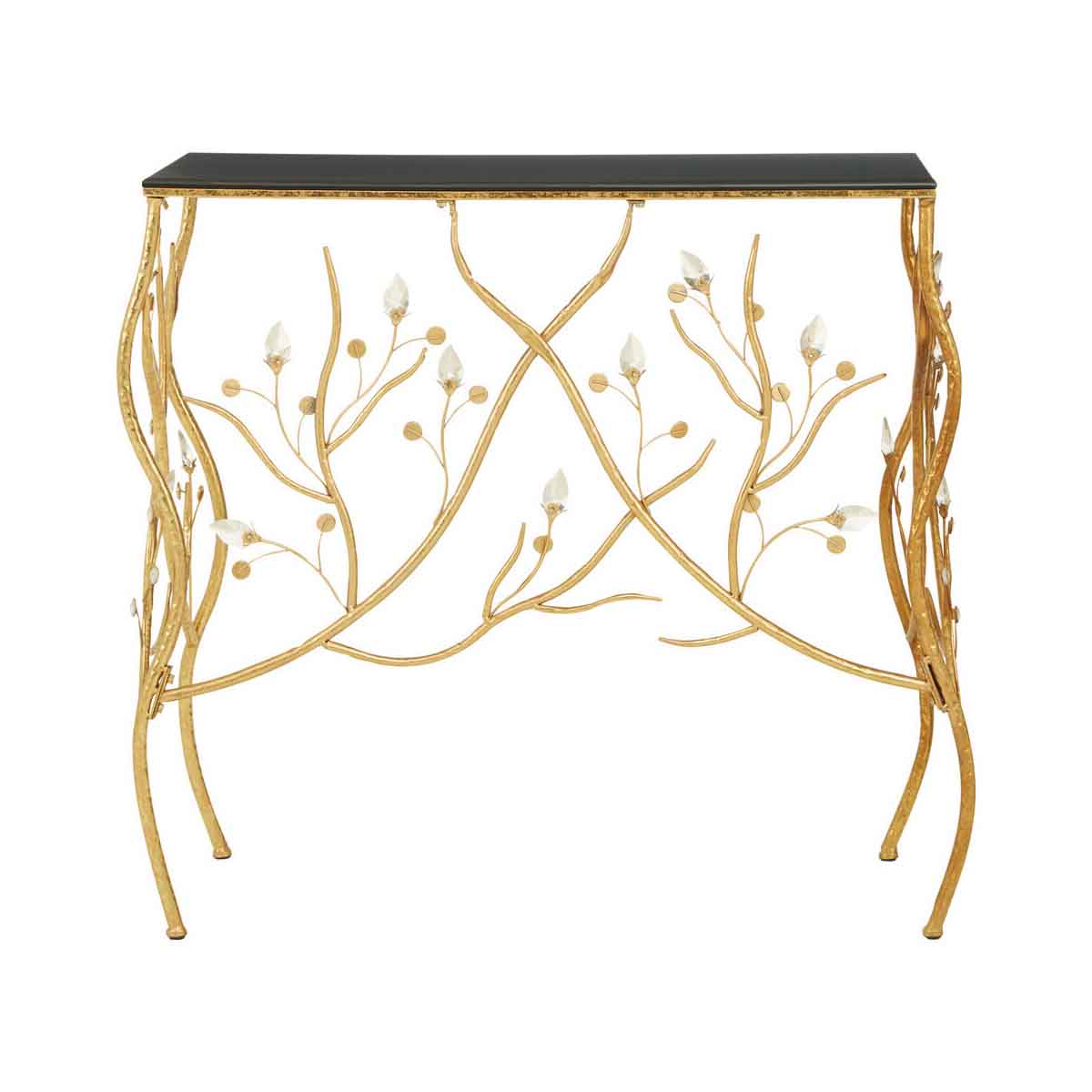 Yaxi gold metal frame console table has a textured gold finish. Its four feet scroll into the stand, while under the top, iron branches are adorned with glinting acrylic buds. Its rectangular top is crafted from wood and has a black colour that contrasts with the gold.