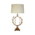 Crafted from iron, the Zahra table lamp's base and ring-shaped body boast a warm gold finish that radiates style. Inspired by branches extending from plants; thick metallic wire forms sprout from the lamp's body, with pear-shaped crystals adding a luxurious touch. A white linen drum shade diffuses light for an ambient glow.