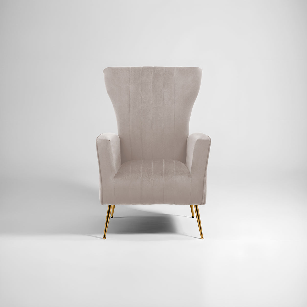 This mink velvet accent chair exudes elegance with its vertical channel tufting on the backrest and seat. The arms slope inwards, adding style and comfort. The winged backrest and slanted legs give the chair a captivating visual appeal.