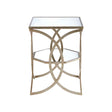 The Zariah side table's base features a series of semi-circles intersecting to create a unique geometric design. A distressed antique silver finish gives the Boutique style table a vintage edge.