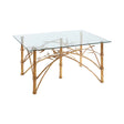 The frame of the Zariah table is made from metal, its legs formed to resemble bamboo stalks, with arcing branches that support small birds. Its rectangular top is formed from clear tempered glass.