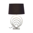 The Zayda table lamp is modern and chic. The base is crafted from brushed chrome metal and is formed into a circular abstract sculpture, this is complemented by a minimalist black linen shade.