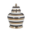 Alternating horizontal stripes of gold, white and black over the white ceramic decorate the Zeina small jar and accentuate its bold curves. The jar has a urn shape featuring a removable flared lid.