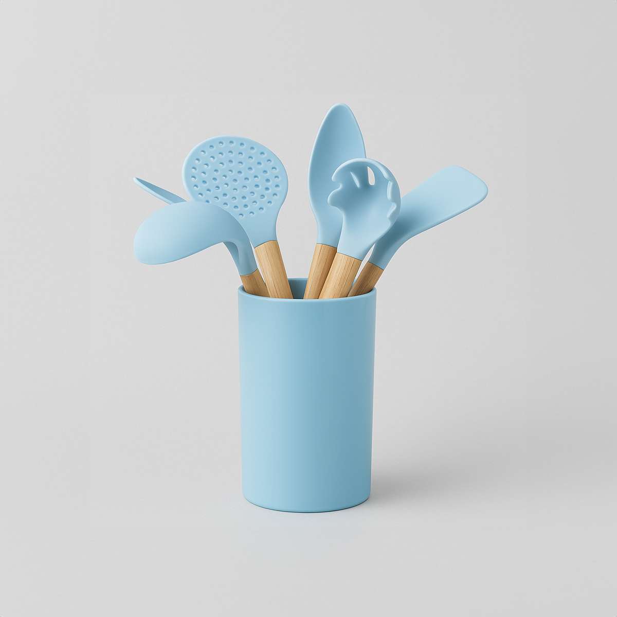 The Zing pastel blue utensil set consists of a spaghetti server, ladle , turner, slotted turner, skimmer , solid spoon and a utensil holder. The utensils have wooden handles and silicone heads. This set is a sleek solution designed to enhance the kitchen and minimise mess.