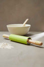 This green silicone rolling pin with wooden handles is and an ideal baking companion and is great for rolling out pastry, pizza dough and much more. The smooth wooden handles allow you to maintain your grip while rolling.