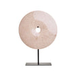 This exquisite large sculpture features a smooth, round cream marble disc with the distinctive natural veining highlighted by a polished finish. The sculpture is gracefully presented on a contemporary black metal frame, offering a coherent, clean and minimalist aesthetic.