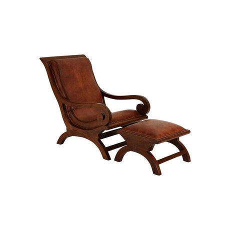 Inca Genuine Black Leather and Teak Lounge Chair with Footstool