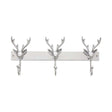 The stag heads are fixed to a rectangular aluminium strip, both with a polished finish that complements silver metallic accessories. Three curving hooks each have a rounded tip that ensures coats and jackets are secured.