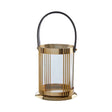 This lantern is a sleek combination of reflective gold finish steel and clear glass. Slim steel piping at the sides breaks up the otherwise minimal aesthetic. A black leather handle provides a material contrast.