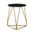 This side table creates a modern geometric form with its sleek and minimal frame accented in a gleaming gold finish. The angular legs combine at the bottom to form a sledge base, topped with a black marble top in a rounded silhouette.