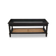 This coffee table features a black finish rectangular frame with four turned legs that are elegantly carved to create a spindle design. A clear glass piece is encased in the top section complete with a lower shelf that is formed from natural rattan in an