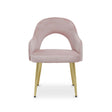 This dusky pink velvet dining chair has foam filled open back that curves to form raised arms, matched with the padded seat. The upholstery blends with luxe brushed gold angular legs which enhance the mid-century aesthetic.