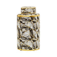 This large ceramic jar in assorted colours features a decorative pattern accentuated by gold finish trim. A matching top sits atop the sleek jar and creates a classic aesthetic.