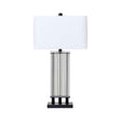 This table lamp features a sleek matte black base and clear glass rods for added transparency. The decorative black finial peeks out from above the ivory shade, adding a touch of sophistication to any room.