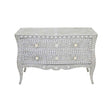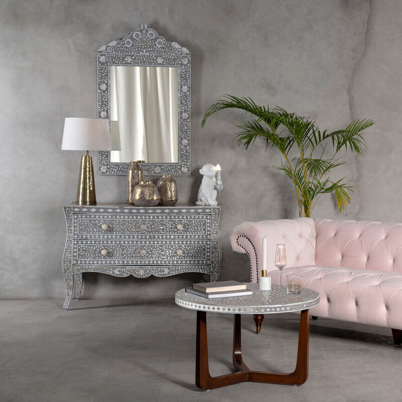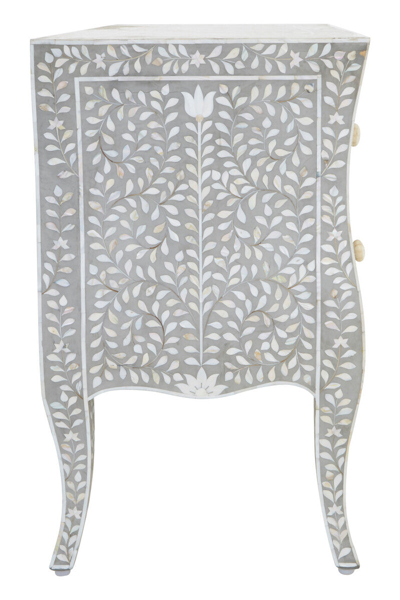 Handcrafted in India by skilled artisans, our Classic Mother of Pearl Inlay chest of drawers is crafted from sustainable mango wood the individual pieces of mother of pearl have been lovingly hand carved and set into dove grey resin to create a beautiful floral design. Featuring two wide drawers, ideal for storing clothes and linens that are perfect for organising and storage . The unit is elegant with the curvature of its cabriole legs and the statement piece will add style and flair to your home.