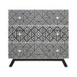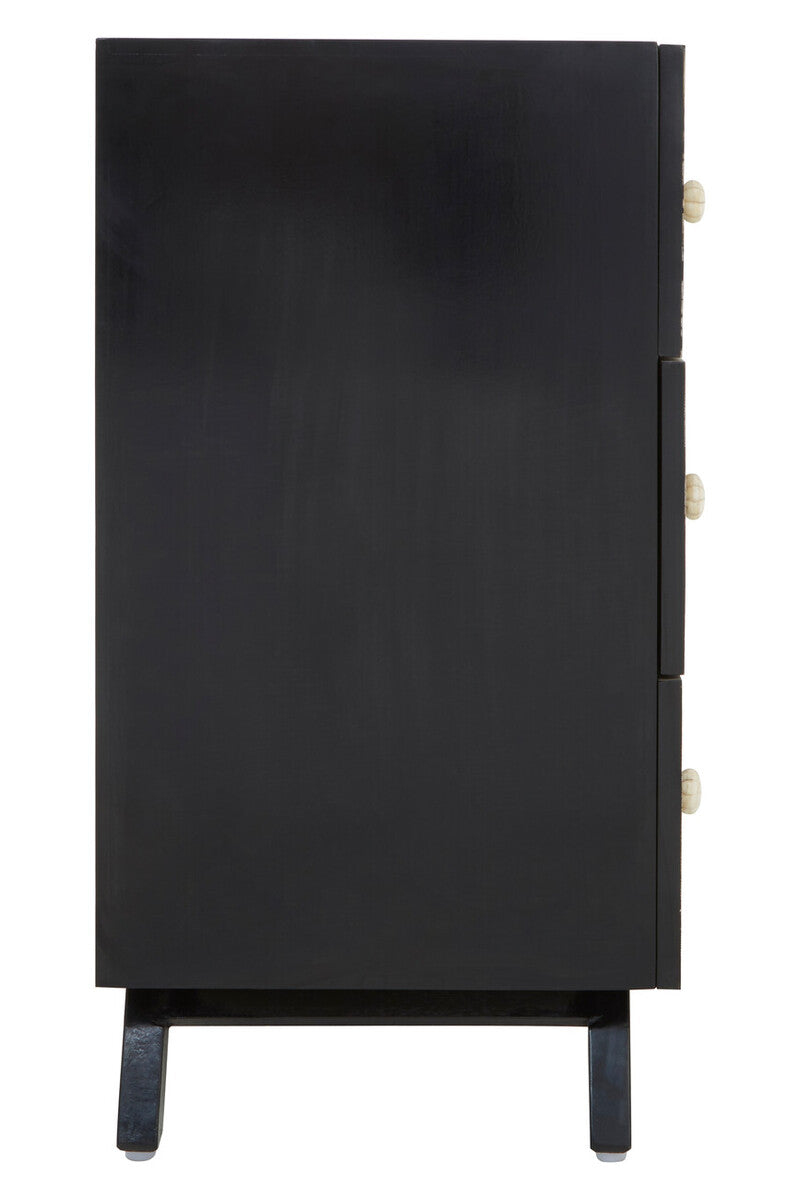 Handcrafted in India by skilled artisans intricately hand carved mother of pearl inlay gives this wide chest of drawers ornate detailing. Crafted from mangowood, the minimal, black finish frame contrasts the geometric pattern in monochrome hues."