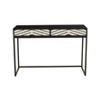 This console table has a rectangular frame with hand laid bone inlay forming an angular pattern. Two storage drawers are adorned with a geometric pattern, each featuring a floral drawer knob.