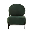 This green velvet armchair blends retro and contemporary design with a round back and slender black metal legs. The smooth seat and slim legs give the chair a minimalist profile. The back is supported by a sturdy metal frame.