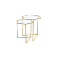 This set of two tables has a stackable design that offers compact storage. Made from warm gold finish steel, each table features clean lines which bend to form a hexagonal top with mirrored glass insert and an open triangular base.