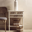 This natural wood console table is elegantly carved, featuring a pearl white finish for a muted aesthetic. Its storage drawers with carved detail in are finished with decorative metallic handles. The lower shelf is matched with the clean-lined top and can be used to display objects or for storage.