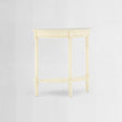 The Heritage pine wood console table is both functional and stylish, featuring a semi circular tabletop in an antique white finish. The carved spindle legs add to its elegance, while the lower shelf provides open storage space.