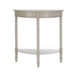 The Heritage pinewood console table is both functional and stylish, featuring a semi circular tabletop and a vintage grey finish. The carved spindle legs add to its elegance, while the lower shelf provides open storage space.