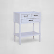 This sustainably sourced console table in a clean hand carved design creates a classically inspired aesthetic. Accented in pearl white finish, the table has three drawers complemented with handles in a sleek black finish. An additional shelf at the bottom provides open storage.