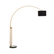 The floor lamp has an arched brass frame with a round, black fabric shade. The curved frame is supported by a weighted black marble base. This contemporary floor lamp makes a great reading light or can be used to create a cosy atmosphere.
