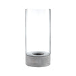 The base of the Jain candle holder is made from eco-friendly mango wood and has a pale grey colour that complements Nordic design settings. A pillar candle can be displayed in the round opening in its base. The textured finish on the clear glass hurricane shade is created by artisans who hammer each shade to give every unit its own unique variations. *This item is handcrafted so please expect slight variations to the finish*