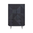 This Jakara wooden cabinet in black finish features a carved wood effect of abstract geometric patterns. The sleek minimalist metal base and legs complement with modern decors.