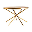 This round dining table features a smooth wood top, supported by a sculptural gold-finished metal base. Its bold intersecting design creates a stunning focal point, adding a touch of sophistication, perfect for contemporary interiors.